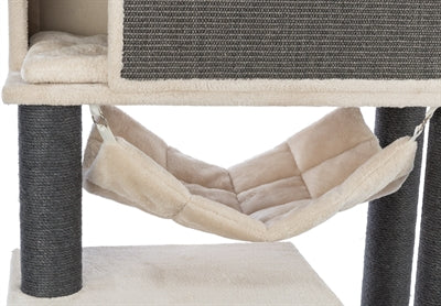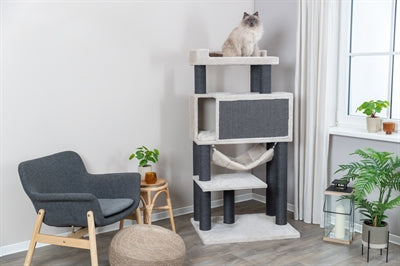 De Trixie Krabpaal Maciel Grijs 155 cm is een mooie krabpaal in strak ontwerp met jute en verschillende ligplekken voor grote katten. Krabben is een natuurlijke behoefte voor de kat. Hiermee markeert de kat zijn territorium en verzorgt hij zijn nagels. Voorkom dat jouw kat krabt aan meubilair met voldoende krabmogelijkheden, zoals deze mooie krabpaal van Trixie. Deze paal bevat verschillende ligplekken en een hangmat. De ligplekken zijn gemaakt van heerlijk zacht materiaal en zijn bekleed met pluche voor meer slaapcomfort. Deze grote paal is speciaal ontwikkeld voor grote katten zoals de Maine Coon. Deze mooie paal hoort thuis in elk kattenhuishouden.